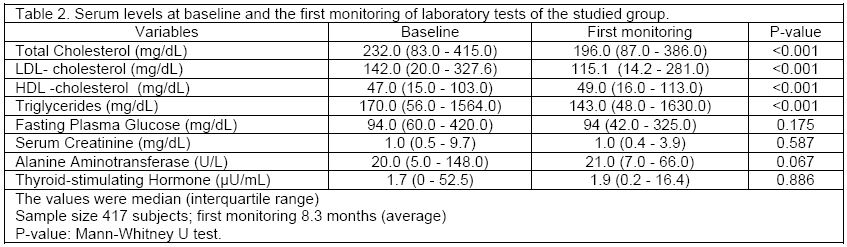 Serum level of total cholesterol, triglycerides, HDL-cholesterol and LDL-cholesterol were significantly lower (p<0.05) in the follow-up evaluation, when compared to the serum dosages at the beginning of the treatment. Serum levels of alanine aminotransferase, thyroid-stimulating hormone and fasting plasma glucose were not significantly different (p>0.05) in the same period.