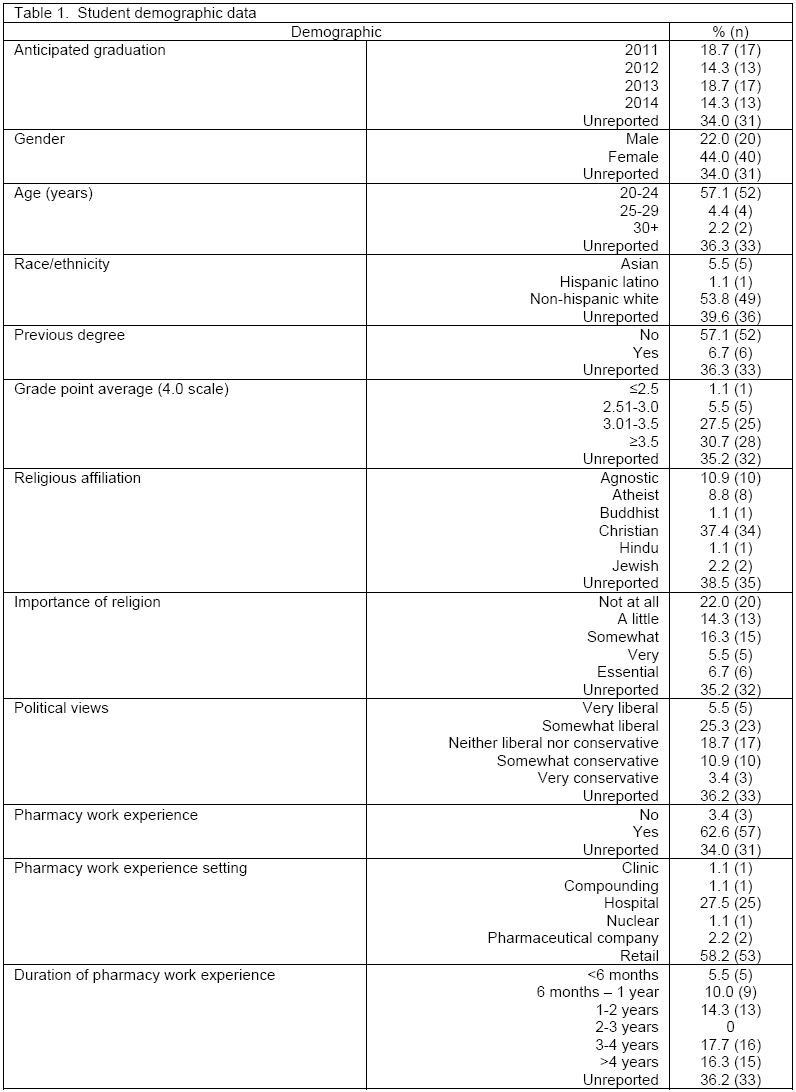 When looking at the demographic information provided by the students, the participant sample closely models the actual pharmacy school population (see Table 1). The majority of students are under the age of 25 years, consider themselves to be non-Hispanic White, and have no previous degree. As with the pharmacy student population, female participants outnumbered male at a ratio of 2 to 1. More than 60% of students considered themselves Christian with nearly 20% considering religion very important or essential. Nearly 90% of student participants who provided demographic data report having a grade point average greater than 3.0. More than 95% reported having pharmacy-related work experience. While some students reported having multiple pharmacy-related positions, the most frequently reported position was in the retail pharmacy setting. Approximately half of the students reported three or more years of pharmacy work experience with the other half reporting two or less years of experience.