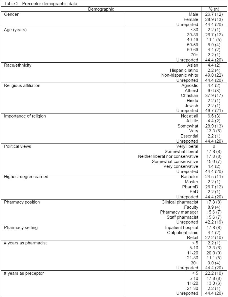 As for the preceptors, participants who provided demographic data showed equal representation by both genders, along with being evenly divided between pharmacists under the age of 40 years and those who are 40 years and older (see Table 2). Slightly more than half of the preceptors who provided demographics reported holding a PharmD, Master, or PhD. Half of the pharmacists also reported working in the retail setting. Only four preceptors reported being faculty at the school with the remaining preceptors divided between staff pharmacists, clinical pharmacists, and pharmacy managers positions. All but one preceptor reported working as a pharmacist for at least 5 years with the majority reporting working as a pharmacist for more than 10 years. Sixty percent of preceptors reported serving as preceptors for 5 or more years. As with the student participants, the majority of preceptors consider themselves non-Hispanic White. Nearly 75% of preceptors considered themselves Christian but less than 5% considered religion very important or essential.