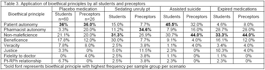 Results: Patient autonomy and non-maleficience were the primary bioethical principles applied by students but pharmacists applied non-maleficience, patient autonomy, and also pharmacist autonomy. For all scenarios, students were more likely to rely on the principle of beneficence, while preceptors were more likely to rely on the pharmacist’s right to autonomy. In the analysis of application of bioethical principles by higher and lower principled reasoning individuals, only in the assisted suicide scenario did the two groups agree on the primary principle applied with both groups relying predominantly on patient autonomy.