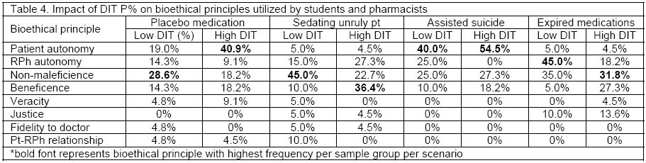 Impact of DIT P% on bioethical principles utilized by students and pharmacists