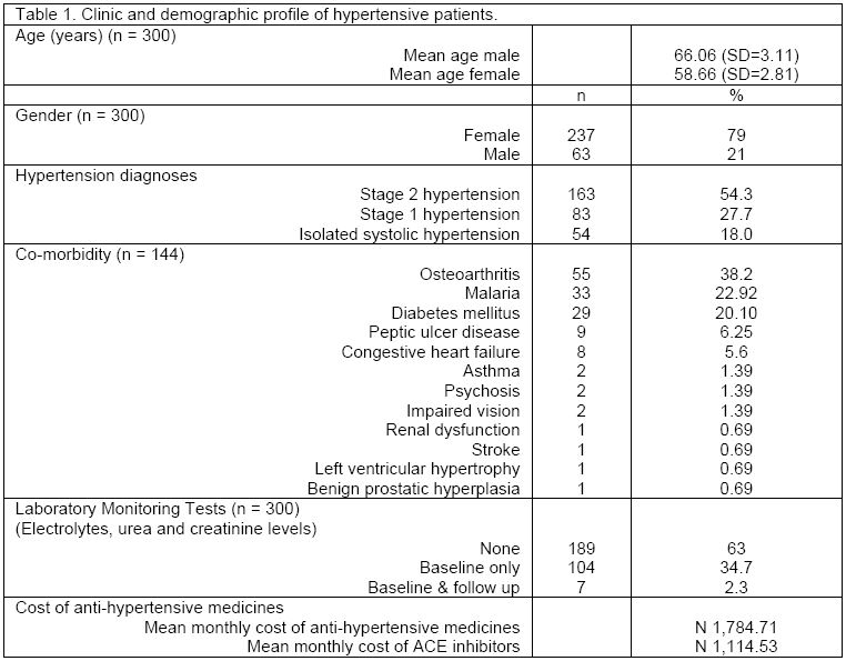 The clinico-demographic profile of the random 300 cohort studied is as shown in Table 1. The majority (79%) of the cohort were females (237) with mean age of 58.66 (SD=2.81) years (minimum-maximum, 33-97 years). Stage 2 hypertension was the most frequent diagnosis (54.3%) followed by stage 1 hypertension (27.7%) and isolated systolic hypertension (18%). The most frequently diagnosed co-existing diseases were osteoarthritis (38.2%), malaria (22.92%) and diabetes mellitus (20.14%). Overall, blood pressure control was documented as adequate in 33% (96) of cohort.