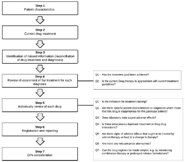 Results: The model contained seven main steps. Information about the patient and current treatment was collected in the first three steps, followed by identification of possible interventions related to either diagnoses or drugs in the fourth and fifth step. The sixth and seventh step concerned the reporting of interventions and the considerations of the GPs. 208 interventions were proposed among the 50 patients. The acceptance rate among the GPs was 82%. The most common interventions were lack of clinical or laboratory data (n=57, 27%) and drugs that should be discontinued as they had no indication (n=47, 23%). Most interventions were aimed at cardiovascular drugs.