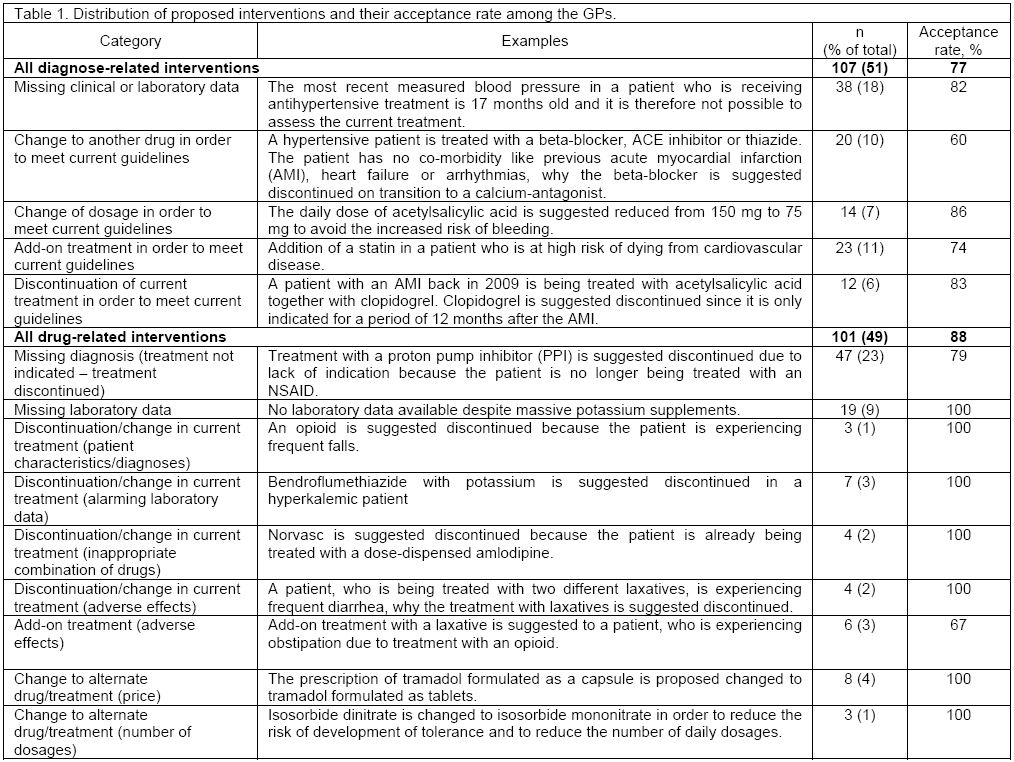Change to another drug in order to meet current guidelines was the category with the lowest acceptance rate. Out of eight rejected interventions, six were attributed to the GPs expecting that the responsibility for the treatment lay elsewhere.