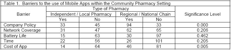 only apparent in the case of company policy (p=0.000). It is apparent that pharmacists working within a regional or national chain were more likely to suggest that company policy would limit mobile app use when compared to counterparts employed within independent / local pharmacy outlets.
