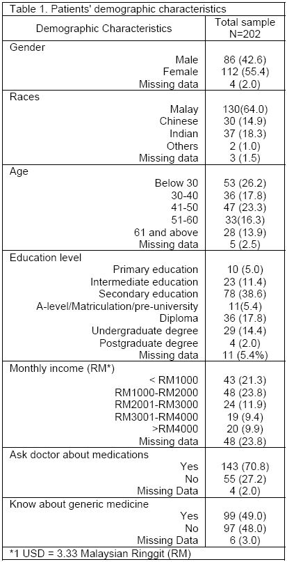 A total of 202 out of 300 patients participated in the study, giving a response rate of 67.3%. Table 1 shows that majority of the respondents were female (55.4%) and Malay (64.0%). About fifty-three percent of the respondents were above 40 years old. Only 16% of the respondents had a university level of education or higher. About 20% of the respondents had monthly income above MYR3000 (1USD = MYR3.33).
