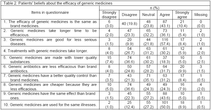 In this study, only 53.5% of the respondents (n=108) believed that the efficacy of generic medicines was the same as original brand medicines. Moreover, 41.5% (n=84) of the respondents believed that generic medicines took longer to be effective. Therefore, most of the respondents (n=133, 65.8%) believed that generic medicines were good for less serious diseases. In terms of quality, only 44% of the respondents (n=89) disagreed that generic medicines were of lower quality. About one third (n=65, 32.2%) believed that generic medicines were cheaper because they were less efficacious. Table 2 shows the responses of the patients on the statements regarding their beliefs about the efficacy of generic medicines.