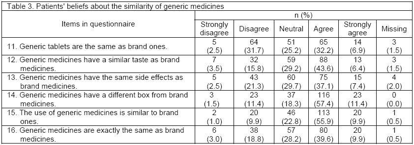 Results: A total of 202 out of 300 patients participated in the study, giving a response rate of 67.3%. In this study, only 49% of them (n=99) knew the term ‘generic medicine’. Moreover, only 53.5% of the respondents (n=108) believed that the efficacy of generic medicines was the same as original brand medicines. In terms of quality, only 44% of the respondents (n=89) disagreed that generic medicines were of a lower quality. About one third (n=65, 32.2%) believed that generic medicines were cheaper because they were less efficacious. In terms of side effects, 44.5% of the respondents (n=90) believed that generic medicines had the same side effect profile as original brand medicines.
