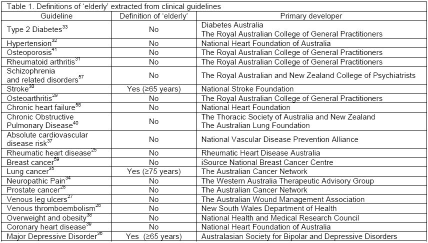 Method: Guidelines pertaining to the use of pharmacotherapy, focusing on conditions described in National Health Priority Areas, were identified using databases (Medline, Google Scholar) and organisation websites (Department of Health and Ageing, National Heart Foundation, National Health and Medical Research Council). Guidelines were reviewed and qualitatively analysed to identify any references or definitions of ‘elderly’ persons.