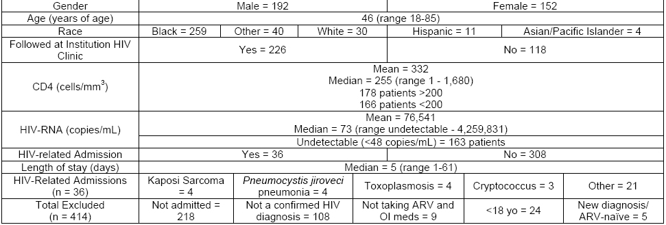 Collected baseline demographic data included gender, age, race, CD4 T-cell and HIV-RNA (viral load) at or within 3 months of admission, renal and/or hepatic impairment, and whether the patient was followed at our institution’s outpatient HIV clinics. Data regarding hospitalization included reason for admission, ARVs and OI medications (for prophylaxis and/or treatment) ordered, formulary status of ARV, date of admission, admitting medical service, presence of a clinical pharmacist on a medical service, presence of ID consult service, and LOS. All collected data was reviewed by the two study investigators with HIV specialty training.