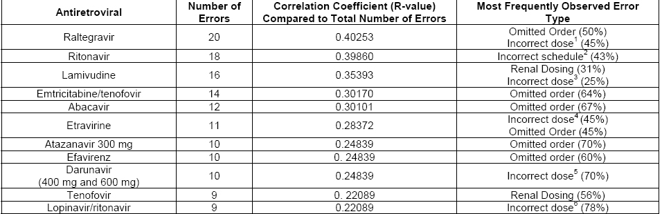 Common errors in our study were omitted orders and/or incomplete regimens and incorrect dosing schedule. Omission of an ARV order was commonly found in other literature5,7-9,12, as was incomplete regimen.4,6-8,13 The frequency of dosing errors found in our study was similar to other studies as well.4,5,6,9,10 Our data revealed the highest frequency of errors occurred in the NRTI and PI classes. This is most likely attributable to the fact that the NRTIs are often the ‘backbone’ of cART and frequently prescribed. The PI class has potential for complicated dosing and almost all require ‘boosting’ with ritonavir, which can be confusing to those unfamiliar with these medications. These 2 classes have been frequently reported as the 2 most common ARV classes experiencing a medication error.4,5,10,12-14