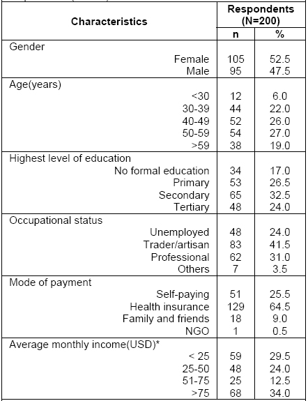 A total of 200 questionnaires were retrieved, crosschecked for accuracy and entered for analysis. This represented a response rate of 89.3%. Many of the respondents (27.1%) were aged 50–59 years. Females were more than males and over a third 65 (32.8%) had at least secondary education. Respondents’ demographic characteristics are presented in Table 1.