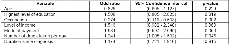 There were significant correlations between level of adherence and educational level [(OR)=1.508; (95%CI 0.805 - 2.825), P=0.019), and mode of payment [(OR)=1.631; (95%CI 0.997 - 2.669), P=0.05).Details of logistic regression analysis are provided in Table 4.