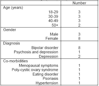 Thirteen of 20 patients treated by the supplementary prescriber during the study period were provided with information about the study. The remaining seven did not meet all of the inclusion criteria or were too unwell to participate (as determined by the pharmacist and their independent prescriber). Twelve patients provided consent for each stage. One patient who gave consent did not participate due to deterioration in mental state; therefore 11 patients participated in the study. Patient demographics are shown in Table 4. The results of each stage are presented below: