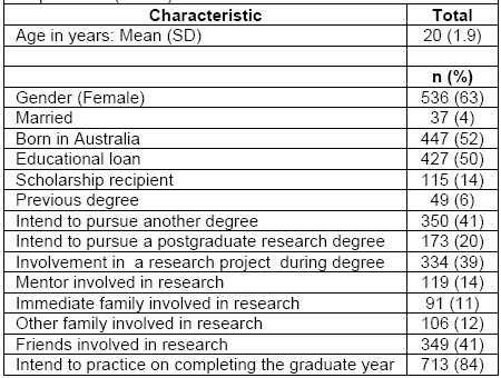 Results: In total 853 students participated and completed the survey (83% response rate). Participants’ characteristics were associated with some but not all aspects of research and pharmacy practice research. It appeared that positive attitudes and perspectives were influenced strongly by exposure to the ‘research’ process through projects, friends or mentors, previous degrees or having future intentions to pursue a research degree. Results from both the quantitative and qualitative analyses suggest positive attitudes and perceptions of research can be nurtured through the formal inclusion in research processes, particularly the utility of practice research in clinical practice across the four years of study. Participants indicated there was a lack of awareness of the needs, benefits and career opportunities associated with pharmacy practice research and voiced clear impediments in their career path with respect to the choice of practice research-related careers.