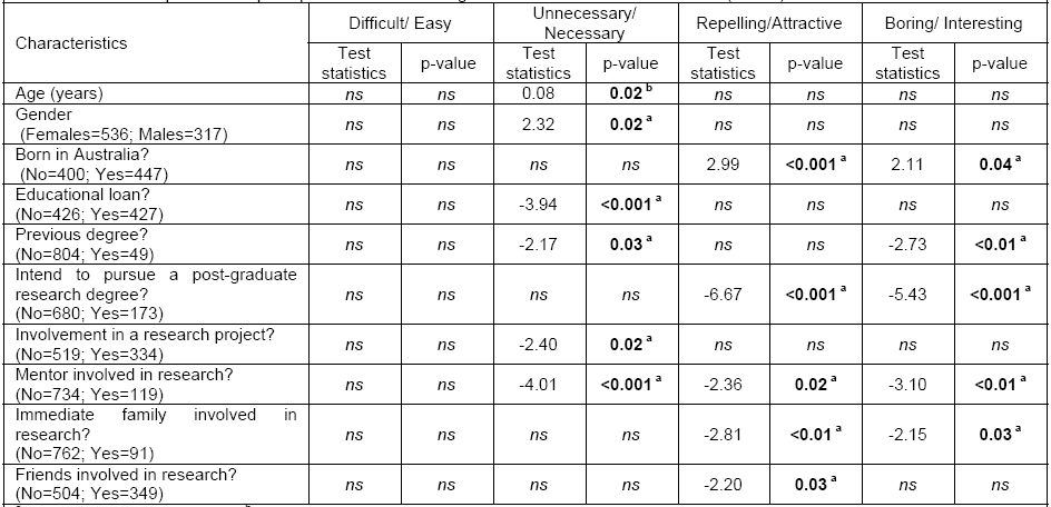Relationships between perceptions of research in general and student characteristics (n=853)
