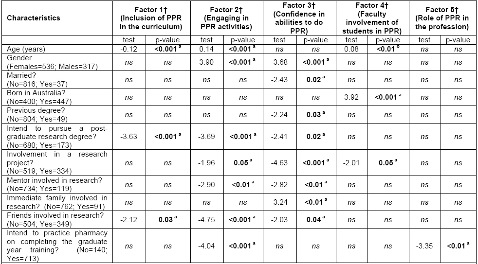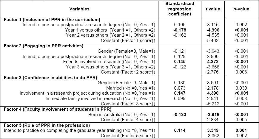 The results of the multiple linear regression in Table 4 show three variables to be significantly related to attitudes to Factor 1 and these explained 5.9% of the total variance (F=15.85, P<0.001); four variables related to attitudes to Factor 2 explaining 7.5% of the total variance (F=16.25, P<0.001); four variables related to attitudes to Factor 3 explaining 5.6 % of the total variance (F=12.650, P<0.001); one variable related to attitudes to Factor 4 and Factor 5 explaining 1.8 % of the total variance (F=15.35, P<0.001) 1.5 % of the total variance (F=11.22, P=0.001) respectively. The most important predictor of attitudes concerning: the inclusion of practice research in the curriculum (Factor 1) was Year 1 of study; engaging in practice research activities (Factor 2) was having friends in research; and confidence in abilities to do practice research (Factor 3) was involvement in a research project during education. The only predictor of attitudes regarding faculty staff support of practice research (Factor 4) was being born overseas, and for the role of practice research in the profession (Factor 5) was intention to practice pharmacy on completing graduate training.