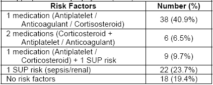 Table 2 showed a breakdown of risk factors that were present in those deemed to have been inappropriate prescribing of acid suppressants. The risk factors selected here were based on those from the ASHP and ACCF/ACG/AHA prophylaxis guidelines. These patients either did not fully fulfil the criteria for prophylaxis in either guideline (80.6%, n=75) or had no risk factor at all (19.4%, n=18).