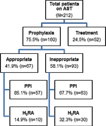 Conclusion: Inappropriate prophylactic AST is a major concern and may even be underestimated due to the lack of appropriate guidelines. More data is required to guide the selection between PPI and H2RA, specifically the more cost-effective use of H2RA in patients with lower gastrointestinal risk or in whom PPI has no clear advantage.