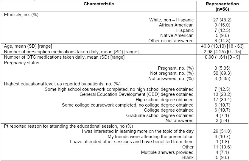 Ten women’s health education sessions were offered between the months of January to November 2014. Overall, 56 participants attended at least one of the offered sessions within the educational series. The characteristics of the educational session participants are shown in Table 1. A majority of participants (51.8%) reported presenting to the educational session because they were interested in learning more about the presentation topic of the day. One participant reported presenting to the educational session because attending an alternative session was beneficial, suggesting there was at least one repeat participant. The specific topics covered and the number of homeless shelter participants present at each session are listed in Table 2. Five student pharmacists were involved with creating and independently leading at least one educational session.