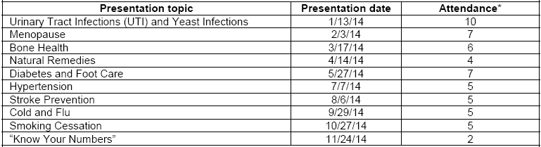 This study provides evidence that pharmacists can be an effective resource for providing education to the underserved women’s population. The most common characteristics of women attending our education sessions were white, middle-aged women taking an average of three medications. Most participants either had some high school education or obtained a General Education Development degree, and were mainly interested in learning more about the topic of the day. Compared to before the presentations, the women participants were significantly more likely to seek a pharmacist for advice as well as rate themselves as knowledgeable after attending the seminar. Our findings are similar to the results of educational seminars provided by nutritionists to low-income women.14