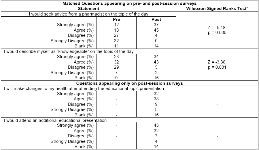 Results: Fifty-six participants attended at least one of 10 seminars from January to November 2014. The average age was 46 years old, taking approximately 3 medications, and 66% completed a high school degree or lower. Prior to the presentations, 30% of participants agreed or strongly agreed that they would seek advice from a pharmacist on the topic presented, which increased significantly to 82% of participants after the presentation (p<0.001). Similarly, 55% of participants rated themselves as agreeing or strongly agreeing with being knowledgeable on the topic presented prior to the presentation, and this increased significantly to 77% after the presentation (p=0.001). After attending the educational session, 70% of participants agreed or strongly agreed that they would make changes to their health, and that they would attend an additional session. The participants noted their increased learning about the topic, the clarity of visual aids and presentation, and knowledge of the presenters as the best parts of the presentation.