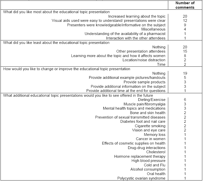 The open-ended questions asked what the participants liked most and least about the educational topic presentation and suggestions for improvement (Table 4). With regards to what they liked the most, the participants most commonly stated that their learning was enhanced regarding the topic by attendance at the educational presentation. Other commonly reported responses included ease of understanding due to the visual aid provided and the presentation style, and the presenters were knowledgeable on the topic. The majority of the responses to what was liked least cited nothing. Other common responses included other presentation attendees, and learning how women are affected by the presentation topic. The most frequent response for how to improve the process stated no improvements/nothing. Other suggestions included providing additional example pictures, handouts, and information on the subject, and providing samples during the presentation. The question regarding what additional presentations the participants would like to see in the future was used to plan subsequent educational topic presentations.