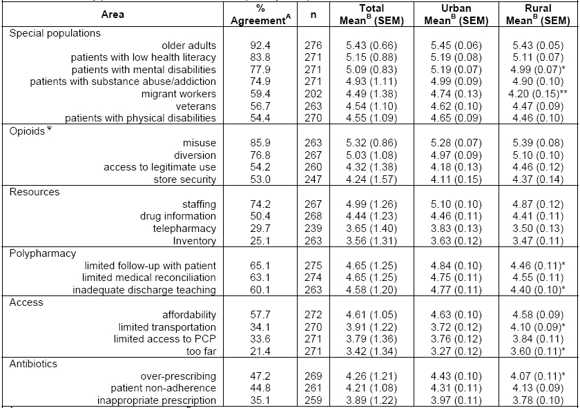 Table 1 displays the percent agreement with each item, and its mean and the standard error of the mean (SEM). The mean and SEM are also presented by urban and rural status. The most “agreed” upon needs were related to opioid misuse and diversion. Agreement was also high for issues related to polypharmacy, such as limited opportunity for medication reconciliation or for patient follow-up. As for specific populations, pharmacists agreed that serving the needs of older adults, those with low health literacy, and those with mental disabilities took additional time, consideration, or accommodations. The costs of medications (e.g., affordability) were viewed with high agreement. Staffing was also identified as a key are of need by almost three-quarters of respondents. When viewed as scales, in order of agreement, pharmacists viewed the six scales as follows: special populations (mean score=4.90, SD= 0.69), opioids (mean score=4.77, SD=0.86), polypharmacy (mean score=4.64, SD=1.03), resources (mean score=4.15, SD=0.89), antibiotic stewardship (mean score=4.11, SD=0.93), and access (mean score=3.93, SD=0.95).