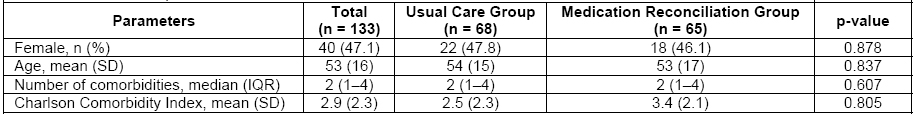 Results: The randomization process assigned 68 patients to UC and 65 to MR. LHS was 10±15 days in usual care and 9±16 days in medication reconciliation (p=0.620). The total number of discrepancies was 327 in the medication reconciliation group, comprising 52.6% of unintentional discrepancies. Physicians accepted approximately 75.0% of the interventions.