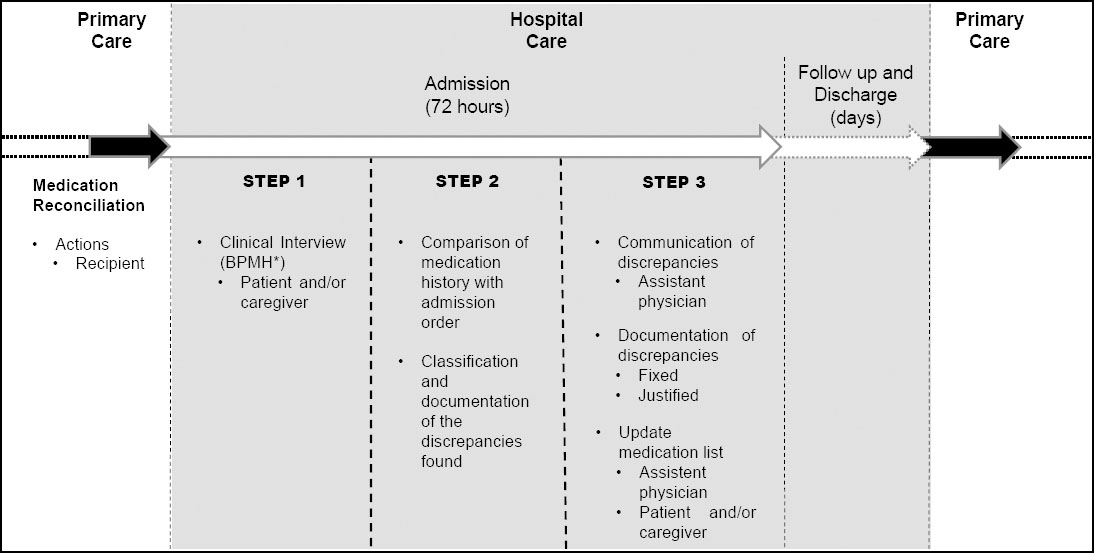 Patients randomized to the UC received standard care provided at hospital admission. In this case the medication history was obtained, at least, by the nursing staff and medical residents, which excludes ethical implications. However, this process is not systematized, and does not have standardized registration method. For comparison with the MR, the UC was submitted only to step 1, described in Figure 1.