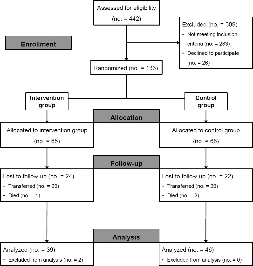 During the six months of the study, 442 patients were admitted and classified as eligible (Figure 2). From this cohort, almost 75% were excluded for the following reasons: refusal to participate (n=26) and not matching inclusion criteria (n=283), younger than 18 years old (n=3), admission not occurring in a study unit (n=30), communication difficulties (n=48), transfer less than 72 hours after admission (n=86), and lack of a pharmacist to conduct the clinical interview (n=116). The randomization process assigned 68 patients to UC and 65 to MR (Figure 2). In UC, during the follow up, 3 patients were excluded due to serious discrepancies (omission of hypoglycemic agents requiring pharmacist intervention) and 19 were lost due to early transfer (n=17) and unrelated death (n=2). In the MR, 24 patients were lost by early transfer (n=23) and unrelated death (n=1). During the period of data analysis, 2 MR patients were excluded who, due to socioeconomic fragility, remained hospitalized for 122 days; according to the consistency analysis, they were considered outliers.