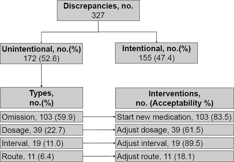 The interventions were conducted only on unintentional discrepancies in the MR that indicated a pattern regarding the type of discrepancy: (a) omission – start medication; (b) dosage – adjust dosage; (c) interval – adjust interval; and (d) route – adjust route. Interventions that resulted in correction within the period of first 72 hours of admission were considered accepted. Finally, to better characterize the service and its specificities, the following process variables were collected: available information sources to collect the medication history and time spent to perform the service.