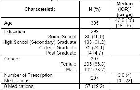 A total of 308 patients completed the questionnaire. The median age of our population was 43.0 (IQR=26) years (Table 1). Approximately two-thirds of respondents were female, 61.2% completed high school (secondary school), 28.8% completed college or postgraduate education, and the median number of prescription medications was 3.0 (IQR=4).