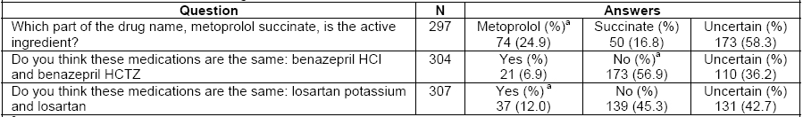 More than half of respondents (58.3%) were uncertain whether metoprolol or succinate was the active ingredient in the medication named “metoprolol succinate.” The remaining respondents were divided with 24.9% of respondents correctly answering metoprolol and 16.8% incorrectly answering succinate (Table 2). Approximately one-third of respondents (36.2%) were uncertain whether benazepril HCl and benazepril HCTZ were the same medication and a minority incorrectly reported the two medications were the same (6.9%). When the same question was asked of losartan and losartan potassium, 42.7% of respondents were uncertain while 12.0% correctly reported the medications were the same.