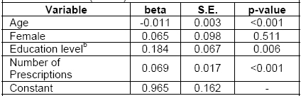 Correct answers from items listed in Table 2 were summed to serve as the dependent variable for a multivariate linear regression with the range of 0 to 3 (Table 4). The number of cases included was 290 as 18 cases had at least one missing data item. Number of prescription medications and education level were positively associated (p<0.001, p<0.01, respectively) with correct responses to questionnaire prompts while age was negatively associated (p<0.001) with correct responses. Gender was not associated with more correct responses.