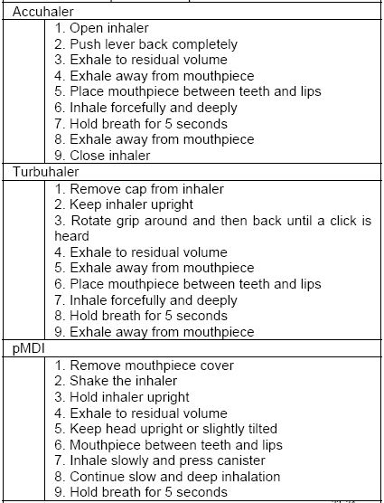 Basheti IA, Bosnic-Anticevich SZ, Armour CL, Reddel HK. Checklists for powder inhaler technique: a review and recommendations. Respir Care. 2014;59(7):1140-1154. doi: 10.4187/respcare.02342