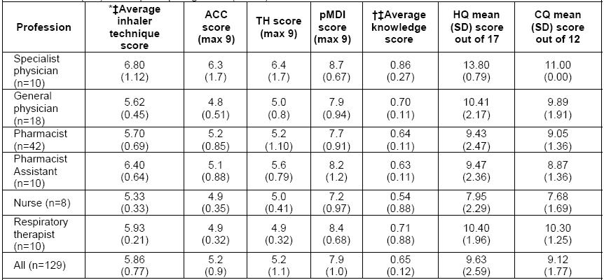 Conclusion: This study revealed significant associations between asthma knowledge and inhaler technique scores for all HCPs. Providing inter-professional workshops for all HCPs involved integrating education on asthma knowledge and practice of inhaler technique skills are looked-for.