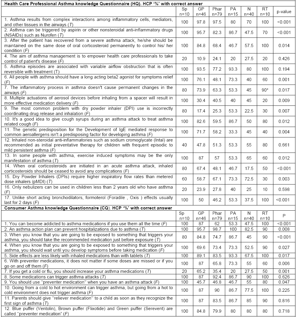 To the best of our knowledge, this is the first study that provides a detailed comparison between the different HCPs with regards to their answers to the individual questions in the HQ and CQ questionnaires. It highlights the pitfalls in asthma knowledge practiced by the different health professionals. These identified pitfalls are important in designing future educational workshops on asthma management.