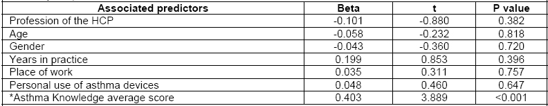 Results: Two hundred HCPs agreed to participate: 10 specialists (medical doctors specialized in respiratory diseases) (5%), 46 general practitioners (23%), 79 pharmacists (39%), 15 pharmacists’ assistants (8%), 40 nurses (20%) and 10 respiratory therapists (5%). Backwards stepwise multiple regression conducted to determine predictors of HCPs’ inhaler technique, showed that out of many independent variables (asthma knowledge score, profession, age, gender, place of work, years in practice and previous personal use of the study inhaler/s), asthma knowledge score was the only variable showing significant association with inhaler technique (R2=0.162, p<0.001).
