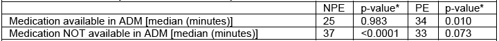 Results: A total of 502 STAT orders were reviewed and 389 orders were included for analysis. Overall, median time was 29 minutes, IQR 16–63; p<0.0001.). The time needed to process NPE orders was significantly less than that needed for PE orders (median 27 vs. 34 minutes; p=0.026). In terms of NPE orders, the median total time required to process STAT orders for medications available in the Automated Dispensing Devices (ADM) was within 30 minutes, while that required to process orders for medications not available in the ADM was significantly greater than 30 minutes. For PE orders, the median total time required to process orders for medications available in the ADM (i.e., not requiring pharmacy involvement) was significantly greater than 30 minutes. [Median time = 34 minutes (p<0.001)].