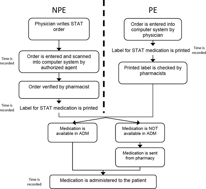 NPE labels show order entry time and verification time, while PE labels show entry time only. These times, along with delivery time of any medication not available in ADM were recorded and used to determine the total time for order fulfillment, as well as the length of time required for each step in the process. In order to ensure blindness, STAT order labels were collected and reviewed by pharmacy staff not participating in the study.
