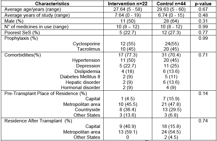 Comparison of demographic characteristics and baseline clinical conditions of patients in intervention and control groups is shown in Table 1. Despite the differences, there were no statistically significant differences between the groups. In the intervention group only one patient (3%) was a native of Porto Alegre, the same city where the hospital is located. In the control group, ten patients (18%) lived in Porto Alegre. Another characteristic that differed between groups was the place where the patients resided after hospital discharge. In the intervention group, most patients (60%) moved to cities in the metropolitan region of Porto Alegre, while the control group remained in the capital (50%).