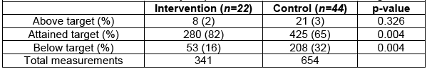 Values obtained indicated that there was an increase in the number of measurements within the desired range in the intervention group. This effect was due to pharmacist intervention.