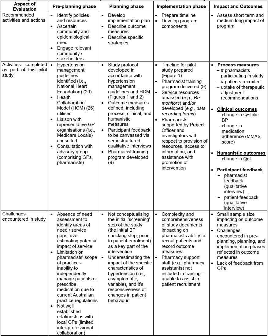 In delivering such interventions, it is important to recognise that the management of hypertension is relatively complex, comprising screening and monitoring of blood pressure, addressing adherence barriers, and reviewing pharmacotherapy.20,21 It is these aspects of hypertension management that Australian community pharmacists need to currently focus on, in preparation for future expanded care services.22,23 Therefore, the aim of this paper is to report on the lessons learned from a pilot study of a pharmacist-led intervention (hypertension management service) in Australian primary care. Specifically, the objectives of this paper are to: 1) describe the key outcomes following delivery of the intervention; 2) report pharmacists’ feedback regarding service implementation and any methodological challenges; and 3) discuss the challenges encountered using a program evaluation framework.