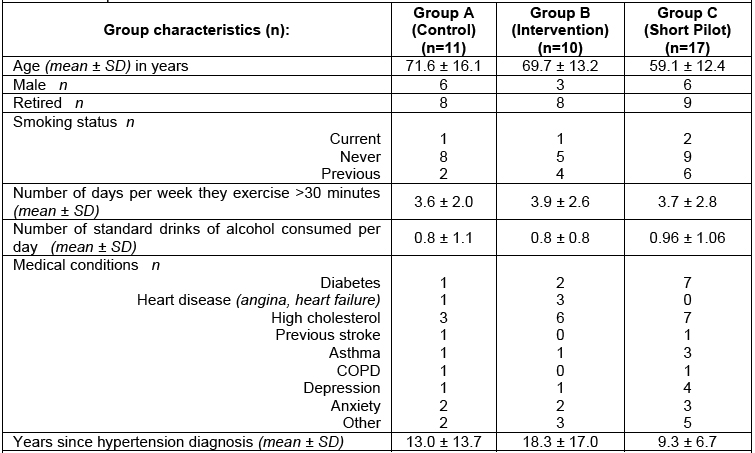 At the screening assessment (i.e., initial BP check prior to patient enrolment) there was no difference in mean systolic BP (SBP; P=0.45) or diastolic BP (DBP; P=0.72) readings between Group A and Group B. Group C did not undertake this screening step.