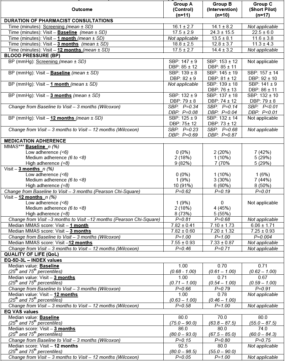 Results: Significant changes to key outcome measures were observed in Group C: reduction in systolic and diastolic BPs at the 3-month visit (P<0.01 and P<0.01, respectively), improvement in medication adherence scores (P=0.01), and a slight improvement in quality of life (EQ-5D-3L Index) scores (P=0.91). There were no significant changes in Group B (the full intervention), and no differences in comparison to Group A (usual care). Pharmacists fed-back that patient recruitment was a key barrier to service implementation, highlighting the methodological implications of screening.