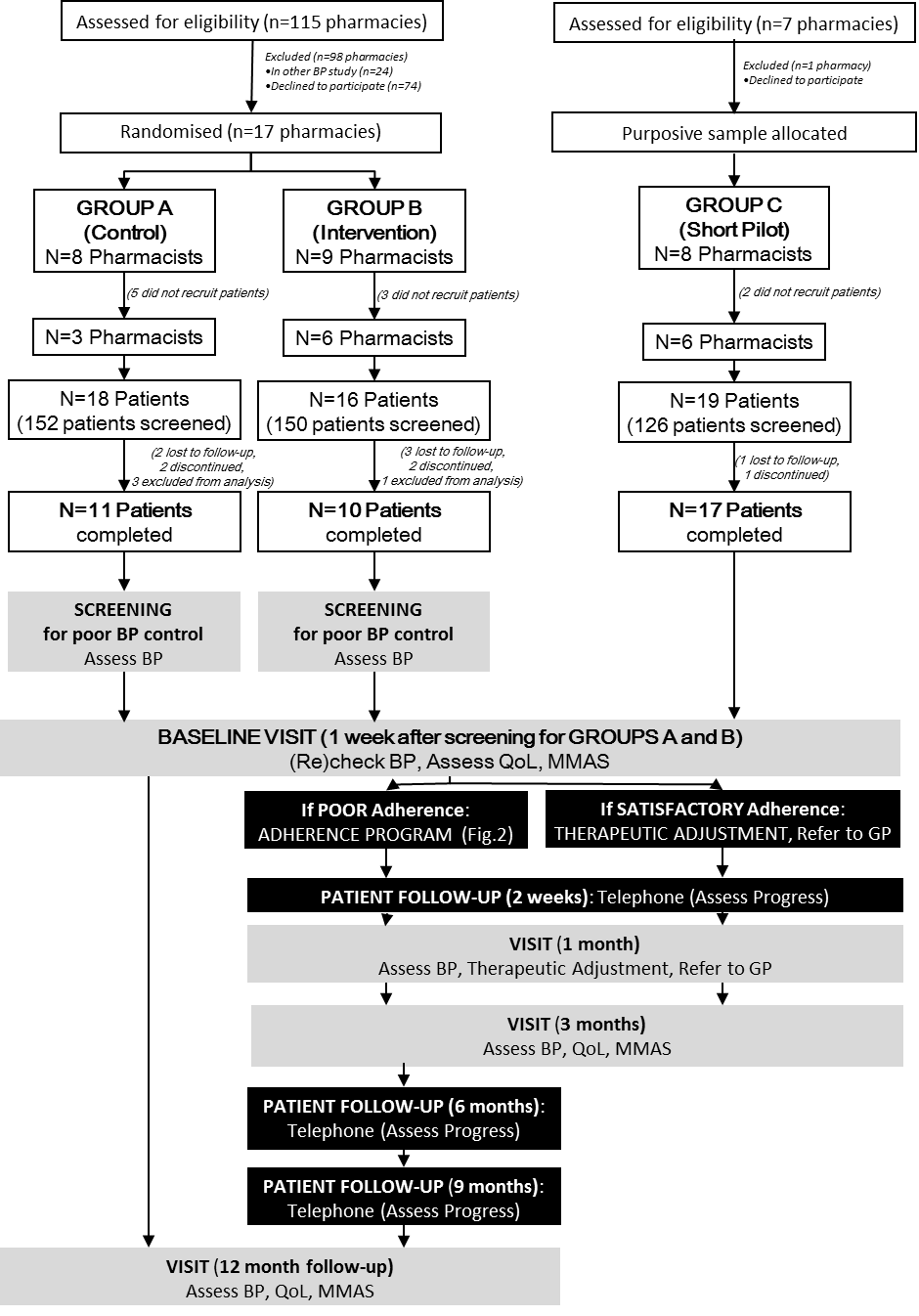 The intervention was delivered via face-to-face visits (follow-up) in the pharmacy interspersed with brief (5 minute) telephone follow-up by the pharmacist (Figure 1). In Group C the intervention was shortened (i.e., final face-to-face visit was conducted at 3-months). Each face-to-face visit involved BP measurement, as well as adherence and quality of life assessments (and/or therapeutic adjustment in Groups B and C) as follows: