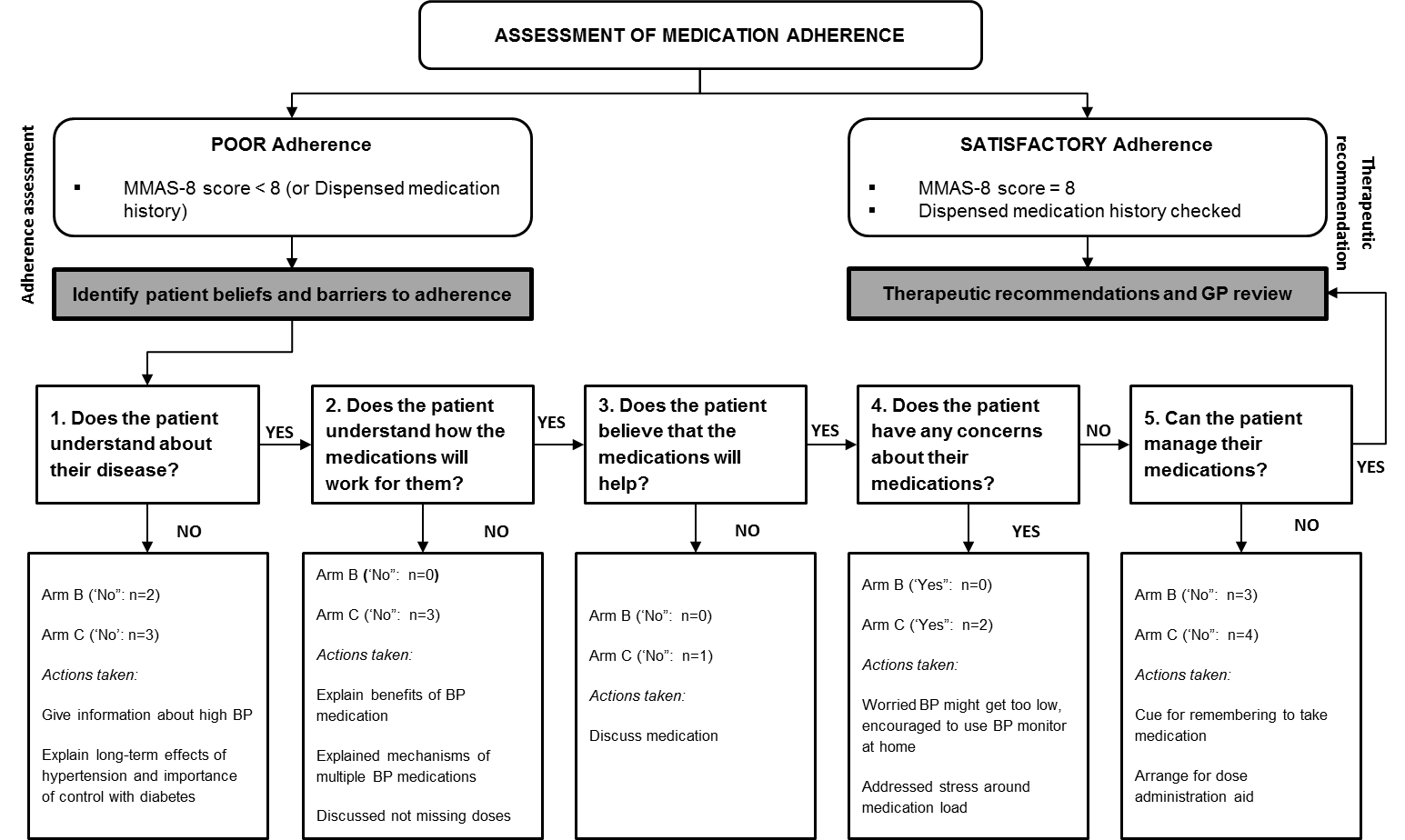 Purpose-designed data collection forms were provided to pharmacists to document service provision and relevant outcome measures. Process measures included the number of pharmacists and patients recruited to the study. Pharmacists’ interventions (adherence interventions and therapeutic recommendations) were initially categorised by the pharmacists themselves (using the flowchart of adherence program, Figure 2) during the documentation process; the nature of these interventions was verified by the Project Officer and one of the researchers, in-line with the categories used by the Pharmaceutical Society of Australia.28 The key clinical outcome measures were: BP control (change in systolic BP) and self-reported medication adherence (using the Morisky medication adherence scale (MMAS-8).29,30,31 Quality of life (QoL)(EQ-5D-3L).32,33,34, was the primary humanistic outcome. Comparisons in outcomes were made between the treatment groups at baseline, 3 months and 12 months (Groups A and B only for the latter).