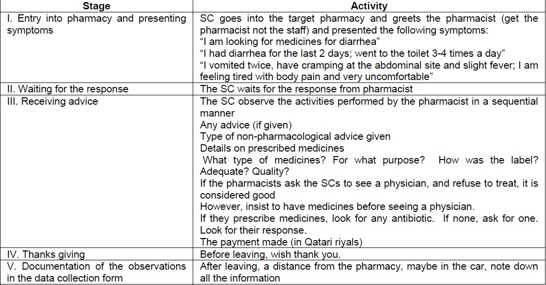 The researchers pre-tested the data collection method to assess its content validity by showing it to faculty members in the College of Pharmacy and a general practitioner practicing in Qatar. After making improvements to the pilot test [here, the researchers used the method (Table 1) on a very small sample size of 3 community pharmacies; these 3 pharmacies were not included in the final study], the method was considered acceptable and was finalized for the main study. The simulated patients were trained 2-3 hours before the pilot study and again after the pilot study. Feedback was obtained from the simulated patients. Problems were rectified, and the necessary improvement/changes were made to the tool and study design.