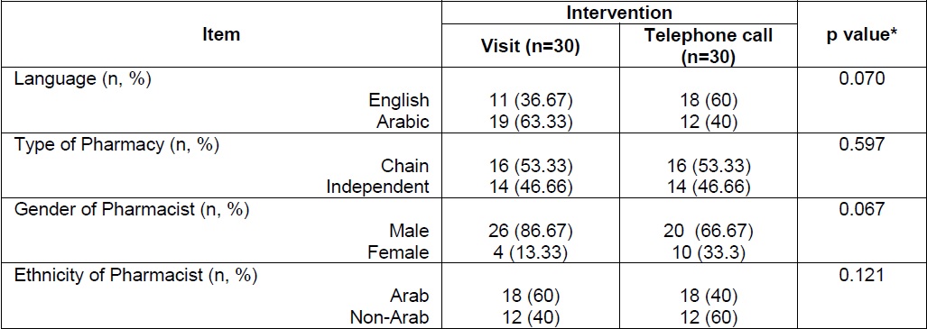 Overall, 30 community pharmacies were visited by 2 simulated patients, for a total of 60 community pharmacy encounters. The demographic details of the respondents are listed in Table 2. There were no significant differences in the study sample’s demographics (p-value>0.05).